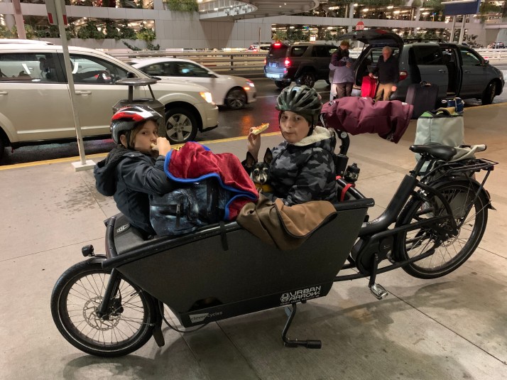 0. I’m worried about getting spoiled/e-bikes are cheating. This one doesn’t get a real place in my numbered list because E-BIKES AREN’T CHEATING so it’s not one of my reasons. However, enough people tease that e-bikes are cheating that it always bears addressing. And I’ve heard lots of people voice concern that they’ll get spoiled when considering getting e-bikes. While I love switching to turbo mode (the most powerful of the four modes) to charge up big hills, I don’t think it’s left me spoiled. I also love using the e-bike to carry both kids far distances, nor has that spoiled me. E-bikes are amazing and fun and zippy, but they’re still bikes. When I’ve stupidly set out without enough battery, I can still pedal the bike once there’s no more juice. I can also choose flatter routes if I’m on a regular bike. Someone with the mindset that e-bikes are cheating isn’t going to change their mind based on my shared experience, but I love adding more biking to our lives by replacing long transit trips. I picked my kids up at the airport (14 miles away) on New Years Day. It was cheaper, quicker, and funner than using the light rail and the bus–which would be my other method of picking them up since I would never carry them all that distance on my Big Dummy or expect them to ride their own bikes (even in the middle of the day in nice weather…which it wasn’t) that distance. Other people are replacing car trips with this sort of trip and that’s the real game-changing awesomeness e-cargo bike create. Now that e-bikes have been around for a bit and lots of data is available, there are oodles of easy-to-find articles with better ammunition than my anecdotes enumerating how much more people bike when they switch to e-bikes.