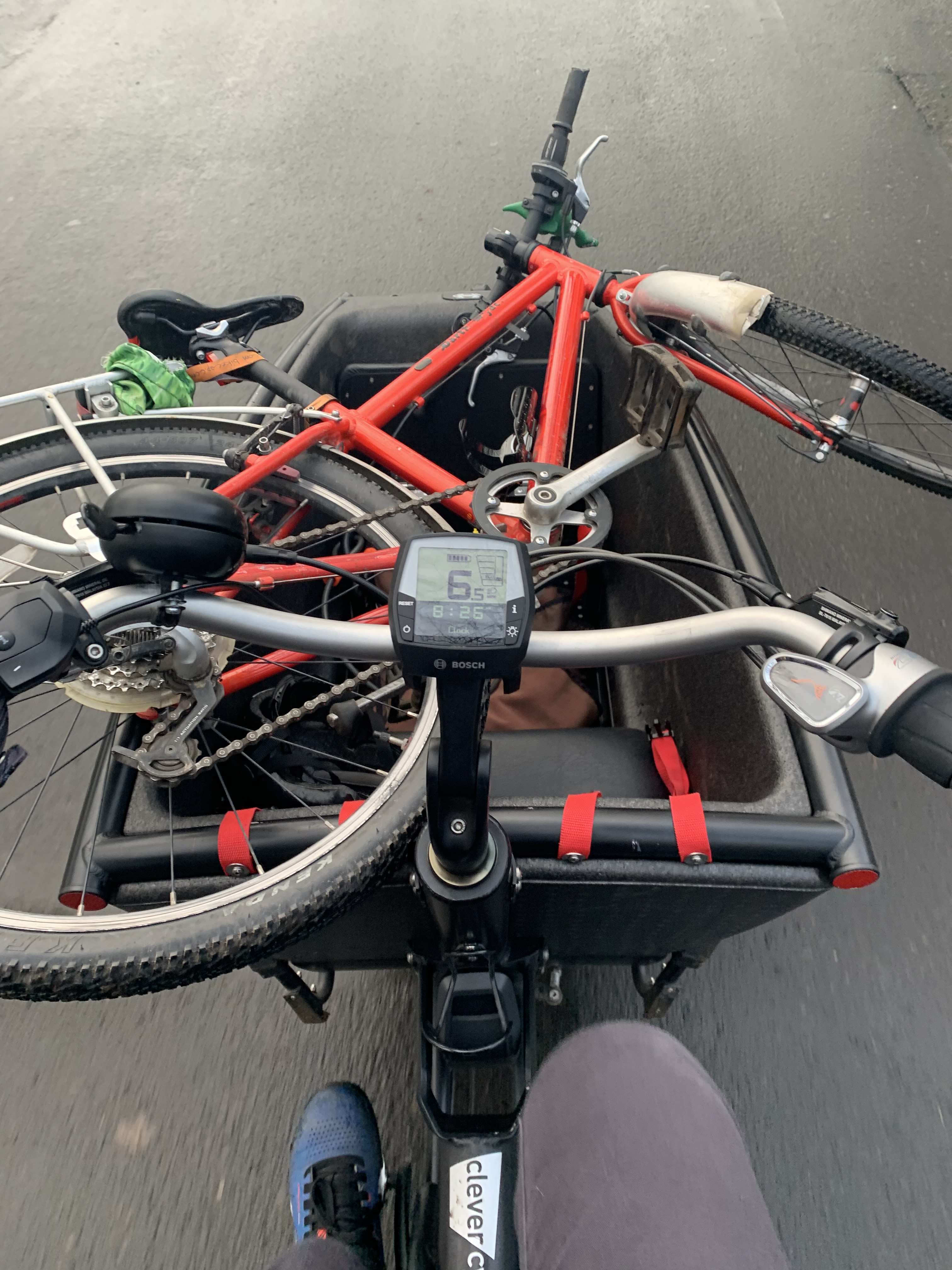 Re #4. I’m forever impressed at big things you can load on your longtail! I get creative and have carried some big loads, but some big things fit awkwardly in the big box (I usually have both my kids with me too) and are too heavy to load on my rear rack. I do love that I can fit both my kids’ bikes into panniers on the rear rack. They stick straight up and I bungee them to each other and to the rack.