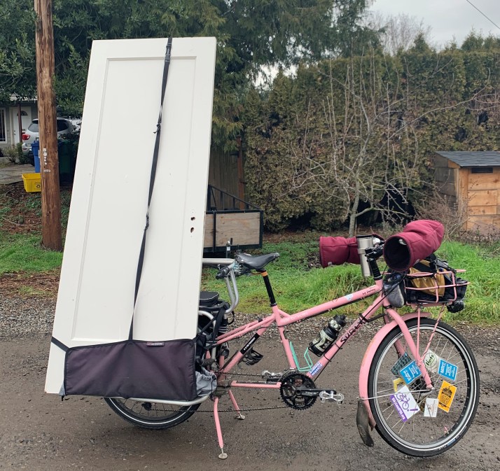 4. I’m better at loading big things in the Big Dummy. This is another thing that would surely change with practice, but while box bikes like the Urban Arrow are wonderful for tossing in bag after bag of groceries, longtails like my Big Dummy are excellent at carrying bikes and other long objects. I’ve been able to carry one kid and his bike with the Urban Arrow by laying the bike across the unoccupied part of the box, but it’s wide. I found the door I’m using as a bike ramp while on my Big Dummy and I can’t imagine having carried that with the Urban Arrow. I haven’t taken to carrying cargo straps with the Urban Arrow so I’m not really giving it a chance as a big-stuff hauler.