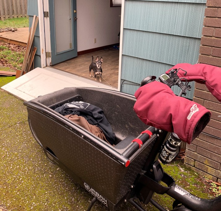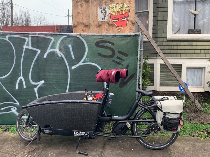This isn’t a direct correlation, but it’s a good “note to self” that I could very well get used to the Urban Arrow’s weight and heftitude: I used to think if I had Pixie before my Big Dummy I would have bought a dog-specific basket. Or at least a deeper basket. I felt this way for a couple years before realizing the existing shallow basket works well enough. I’ll consider myself adapted to the Urban Arrow’s weight once I stop complaining about it. Last week I brought the UA to work, assuming I’d use it to tote my 12-year old to a doctor’s appointment, but when our schedule changing I stomped my foot and whined, “I could have taken a lighter bike today!” I’m clearly not very far along the road of getting used to its weight yet.