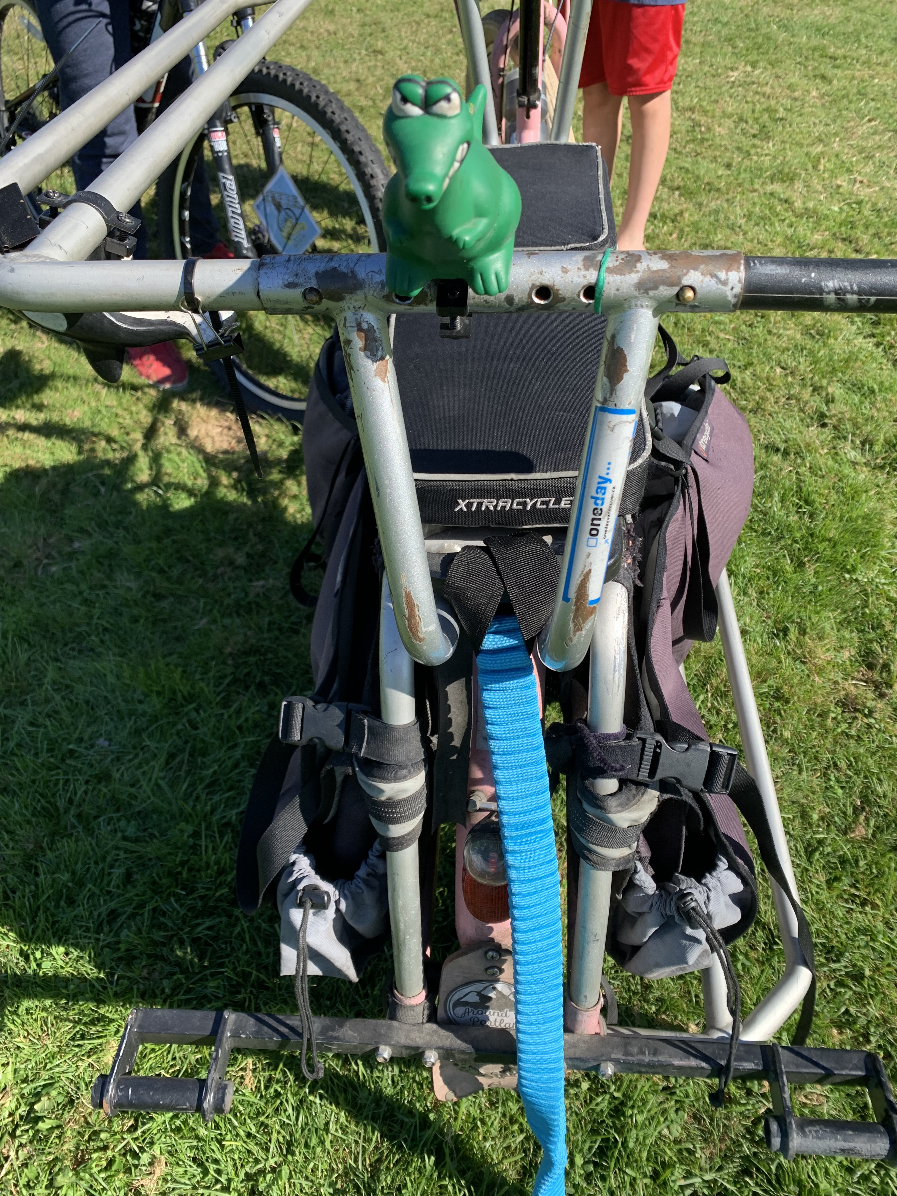 My Big Dummy is a foot longer than a regular bike so rather than lasso the rope over my saddle as designed I looped it through the hole at the back of my Xtracycle FlightDeck. It seems very versatile in terms of attaching to various parts of your rig if the back of your bike has a lot going on that might get in the way of the traditional saddle lassoing method. That said, I also did some towing with a regular bike to confirm it didn’t feel weird to sit on the strap and it was perfectly comfortable. I assumed this product designed for mountain bikers in two-part baggy mtb shorts over padded liners might not feel the same with unpadded mom jeans so I’m happy to report I was wrong. As for the trailing end of the rope, I towed the kids attaching it to their bikes using both methods–quickly slung over the stem and carefully clipped under the stem (see the video at the bottom of the page for details). Both felt secure.
