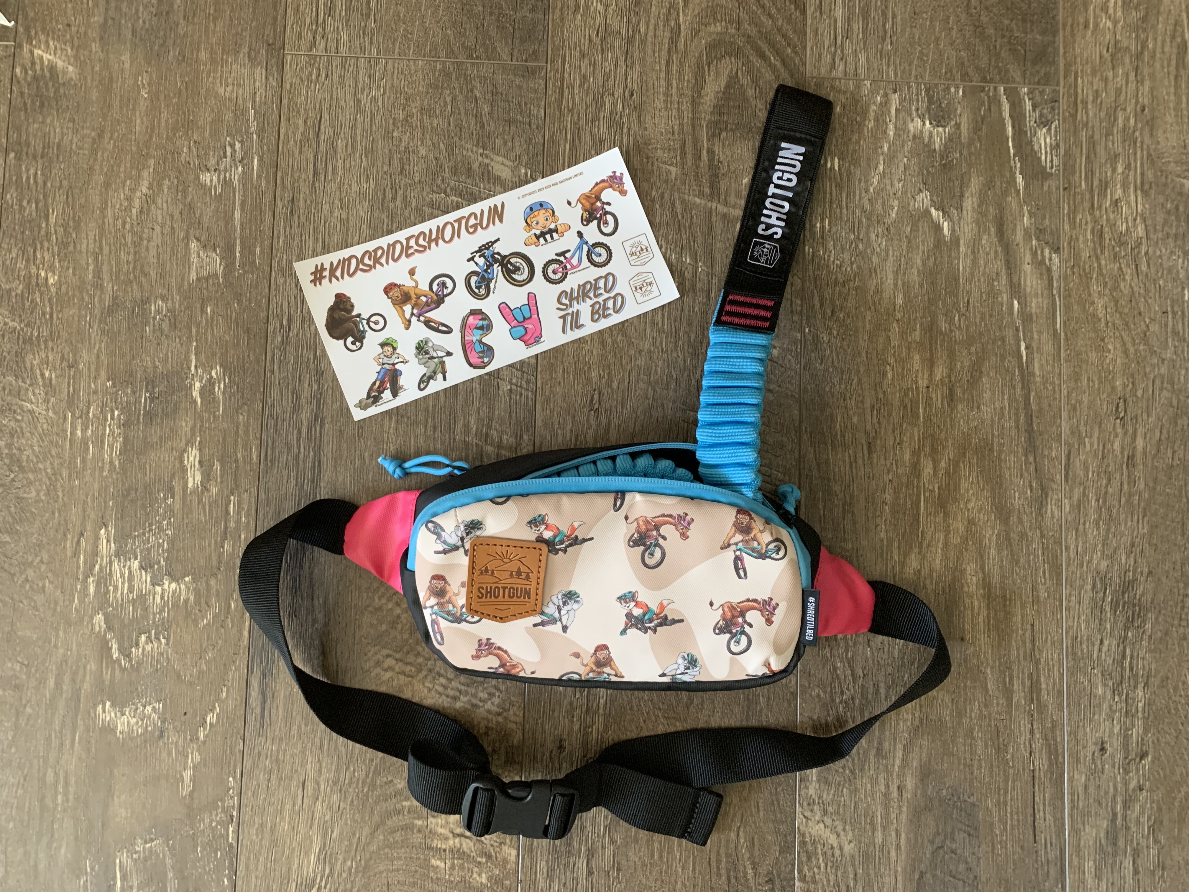 As noted above you can purchase the tow rope à la carte, but the hip pack is adorable. I love that the waist strap adjusts big enough to fit on me so I’ve claimed the hip pack as mine. But I also love that it’s designed to be worn by the kiddo. Having the towed kid in charge of bringing the tow rope and tasked with carrying it is just brilliant. The pack is covered with cute animals riding bikes (whom you can find in the book “Shred Til Bed – The MTB Animal Alphabet”, available on the Kids Ride Shotgun website) and it comes with cute stickers, too.
