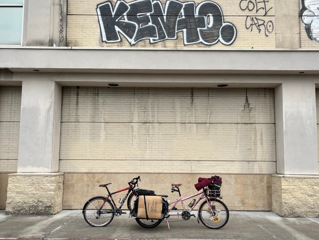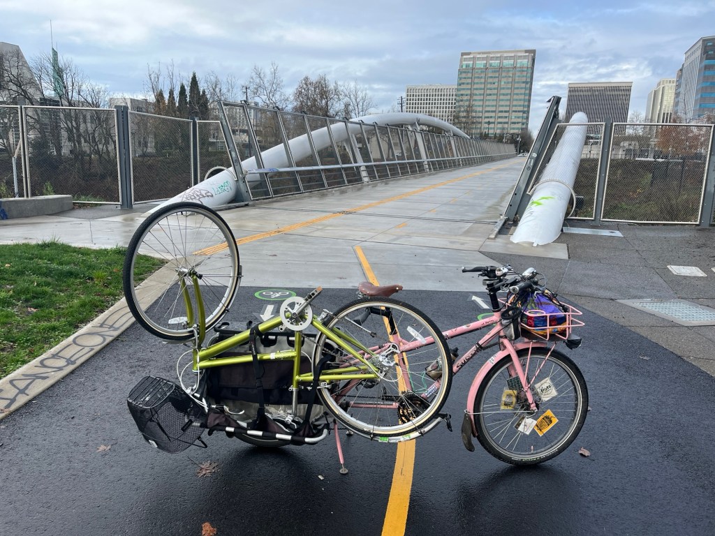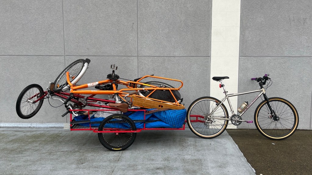 As always, I did a ton of bike hauling because longtails with cargo sling bags are so good at that! I mainly bag-and-dragged bikes (see below), but I also did quite a bit of toting broken or precious bikes up off the ground–often upside down, because that seems to work best (see below below).