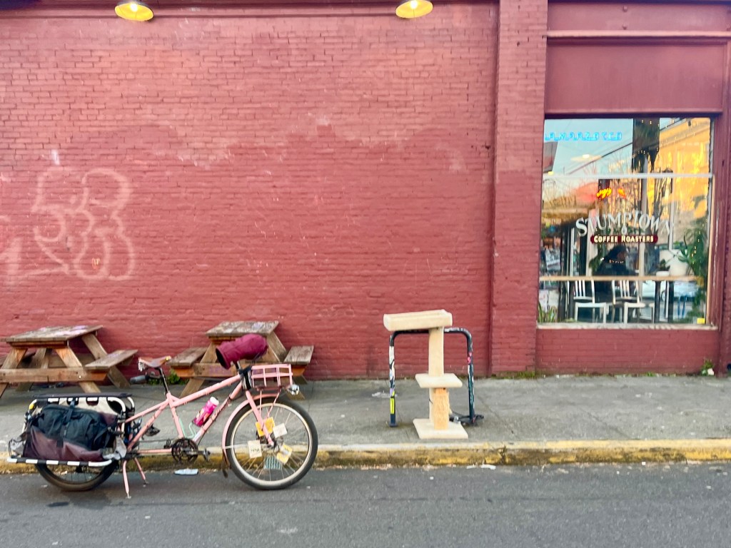 As is the tradition on the special day, it’s time to forget about those other 364 and talk about today! Today was not eventful. I only carried my laptop and only went to the office and back–12.5 mostly flat miles (268 foot elevation gain, says Strava). I was worried it would get dark on my way home before I found a good spot to take the annual glamour shot (sunset was at 4:28 p.m. today, ugh!), but I was greeted with the most Portland sight ever early in the journey–a cat tree U-locked to a bike rack outside a Stumptown Coffee. Say cheese! *click*
