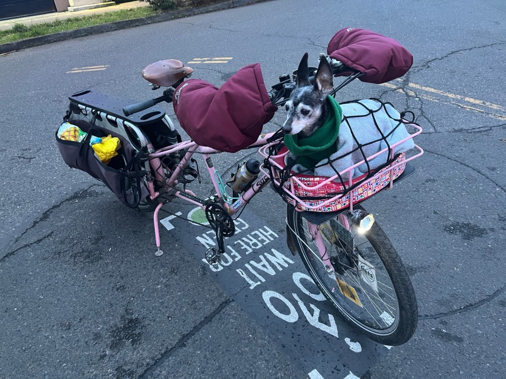 Pixie in the basket in the middle of a four-day-long trip from Portland to Eugene, 2019 (trip report)
