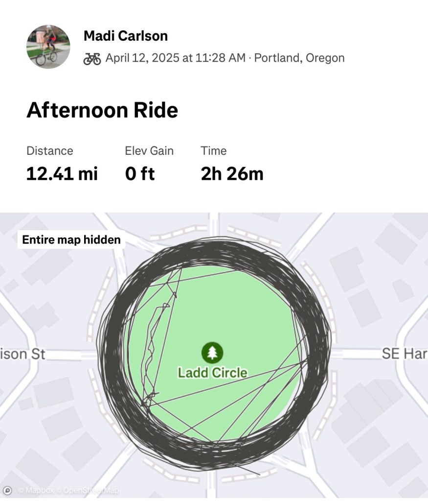 #30daysofbiking day 12: Ladds 500! Today was the “8th first annual” Ladds 500 and it was a blast! I haven’t been in a few years and I knew it would be more crowded than I’m use to and it sure was! It was too congested for my team of three to get around all 500 times. I did 95 laps for team Hot Moms Ride Cargo Bikes (40 with a passenger on my cargo deck), 2 bonus laps as stoker on the back of a friend’s tandem, and three upon arrival so I’m going the declare that 20 miles of circles. I didn’t Strava the whole time, thus the need to calculate. But I Strava’ed enough to get a funny map!