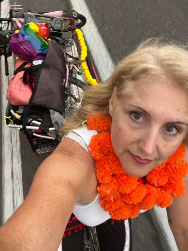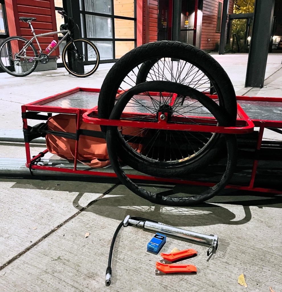 Admittedly, this wasn’t my easiest bike for the job so I switched to my Haulin’ Colin cargo trailer to tote them to and from the venue and return them the following day. Granted, my cargo trailer got a flat, which I’m sure I would have thought was a sign from the universe that I should have stuck with my wobbly wiggly way-too-heavy original choice had it taken longer than 30 minutes to fix.