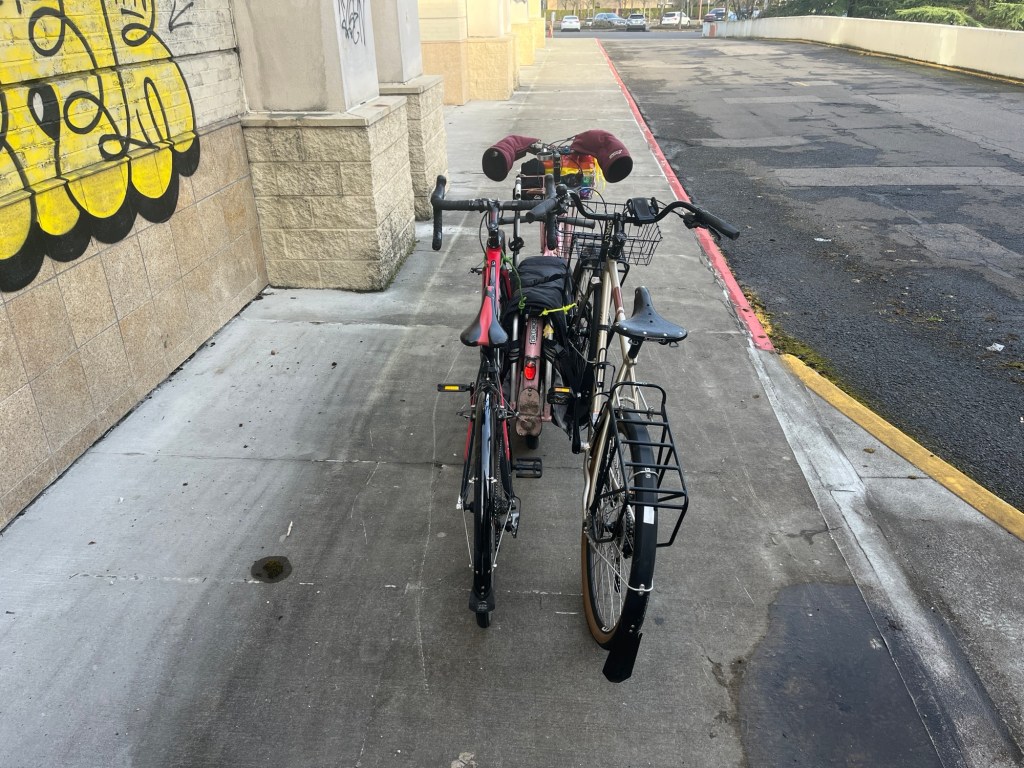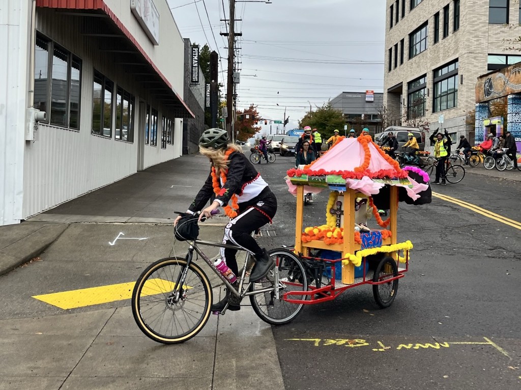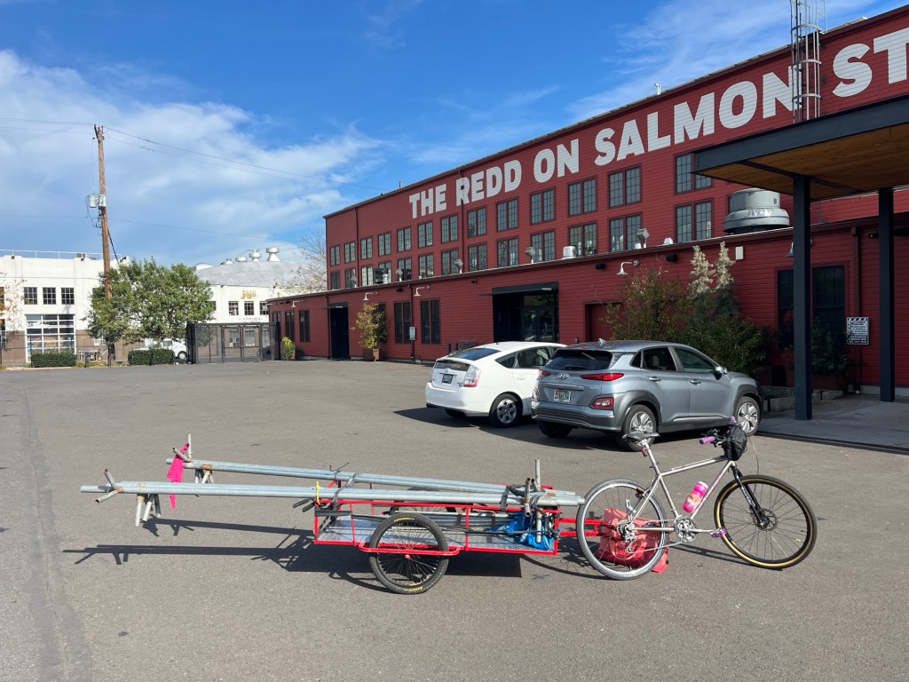 The Big Dummy had another shared job with the cargo trailer for Central Eastside Altares Y Muertos Bike Ride with Milagro and The Street Trust. New this fifth year of the ride, I got to chauffeur a mobile altar with my trailer, but I needed the Big Dummy in the morning before the ride to carry in all the stuff (including my trailer-pulling bike). At the end of the day the best (only?) way to get all the things home in one trip was to carry the Big Dummy with the trailer. I bent the fender stay so if I do that again I’ll load more carefully.