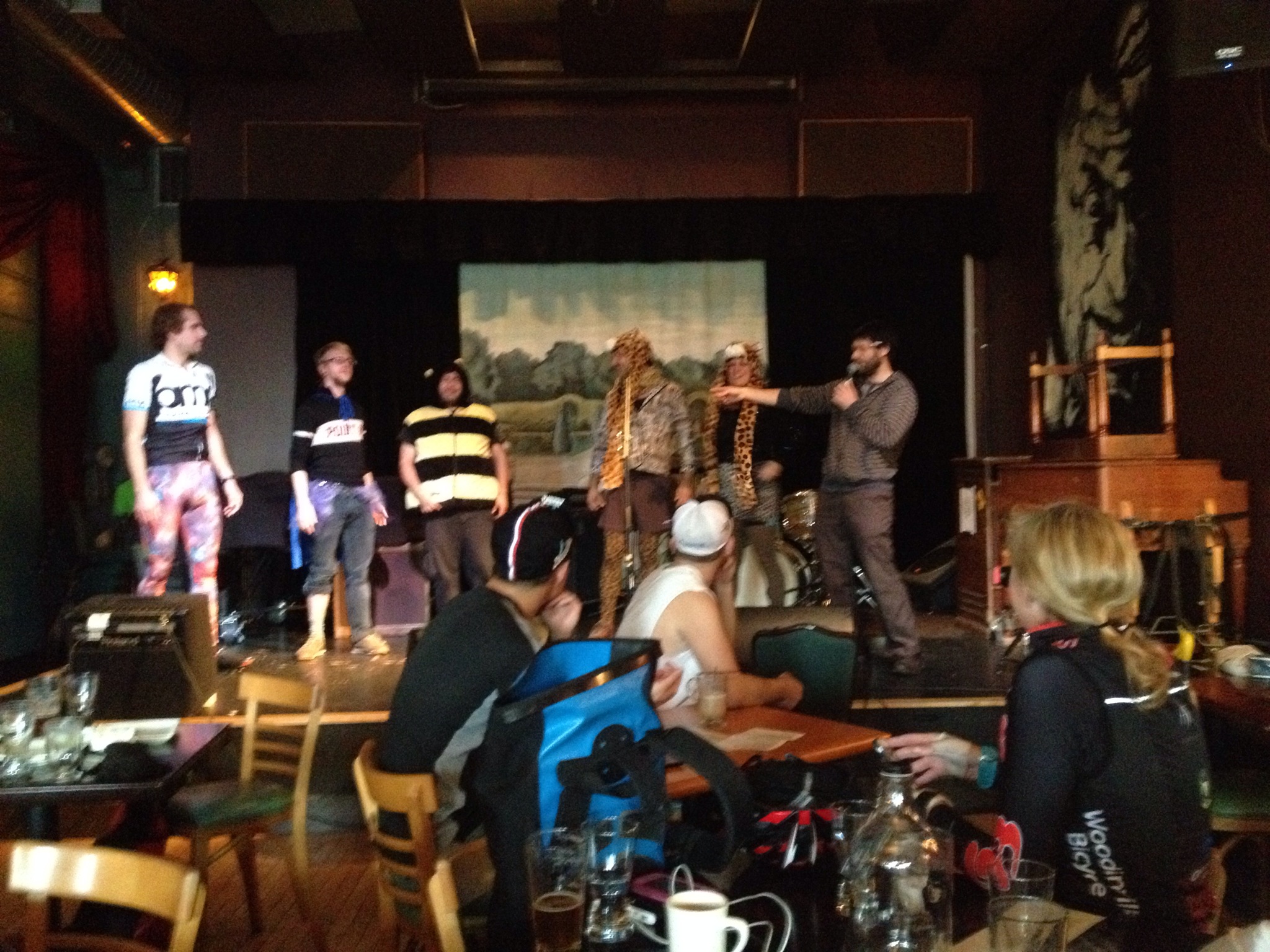 Participants were allowed to form teams of three. We were nine (but five of them were kids). Alyssa on her Xtracycle EdgeRunner with CycleFab/Haulin’-Colin-attached Burley Piccolo trailer bike and one kid, Dave on his regular bike with trailer bike, me on my Surly Big Dummy with two kids, and Barbara on regular bike with kid bike coupled behind with FollowMe Tandem coupler and one kid.