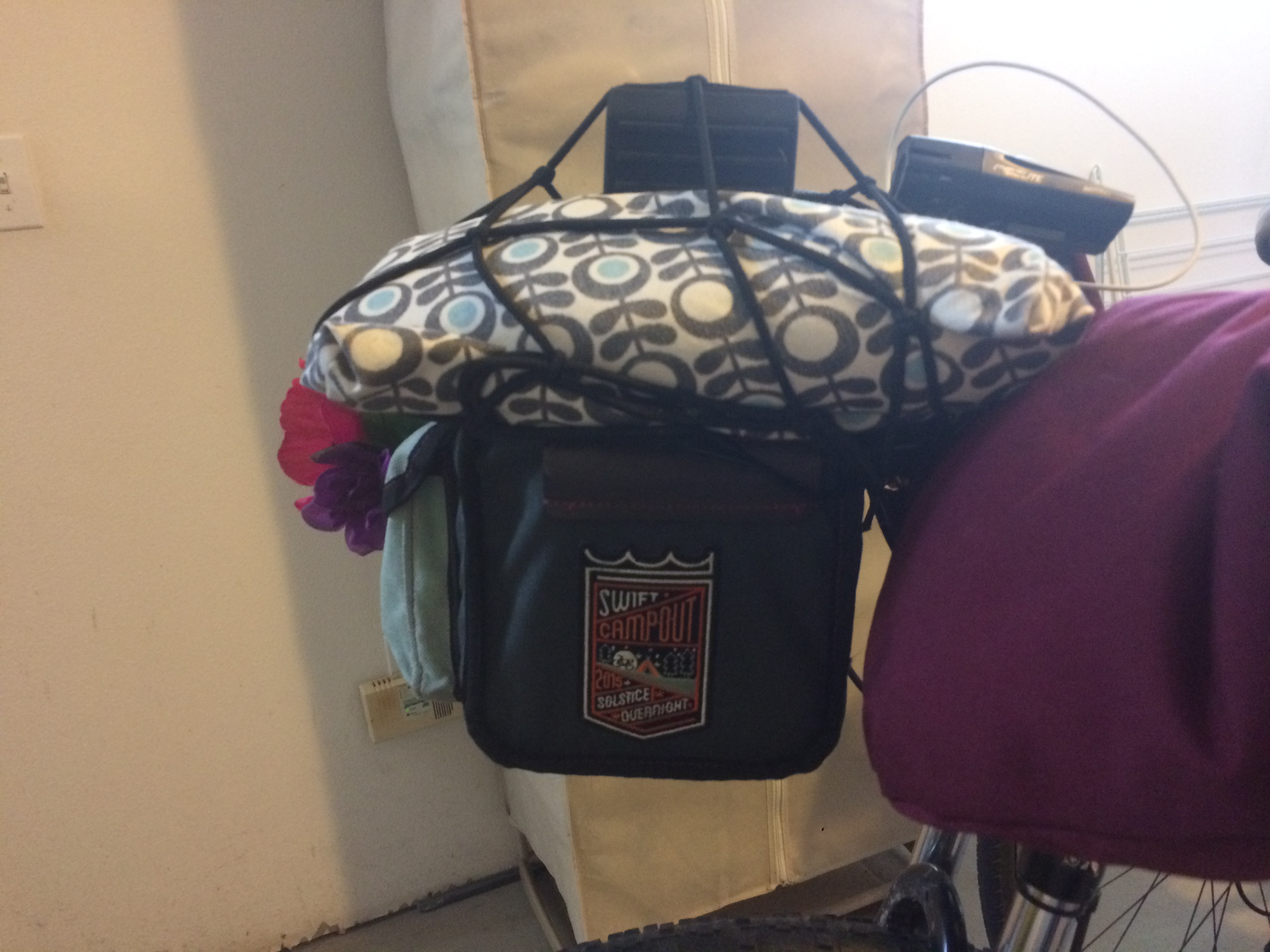 Once I loaded the front bag with lots of stuff–that’s my laptop in a cloth diapering dry bag (waterproof! I use this large size for swim suits) cargo netted on top of the bag–the bag started to droop. Fortunately I didn’t notice this until I got off the train in Portland so I wasn’t worried about it for the long train ride.