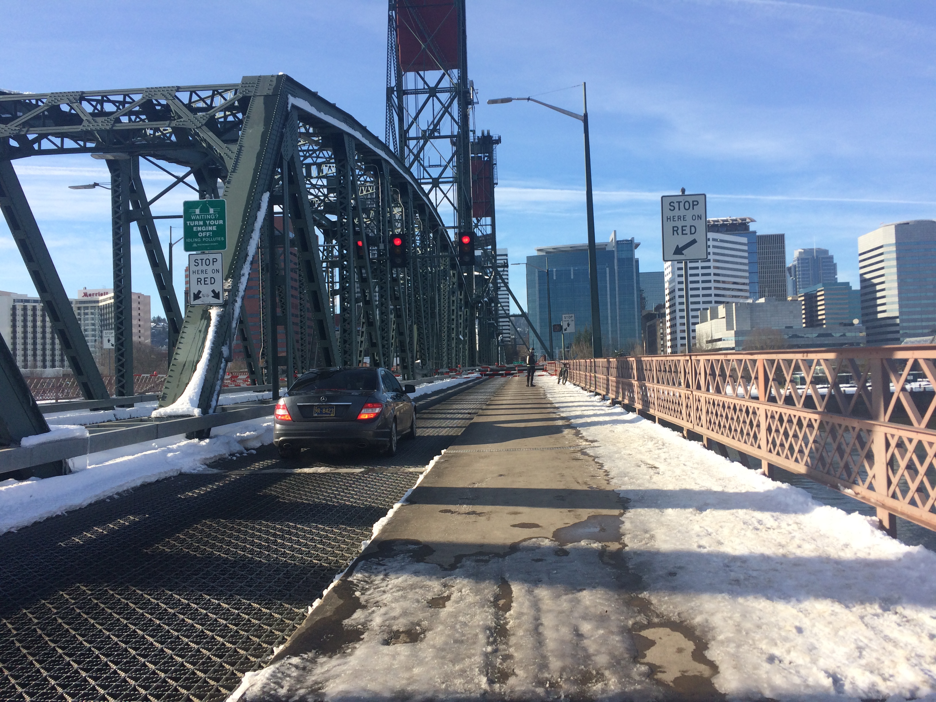 Ah, Portland. I could have squeezed around his car, but figured he’d be quick enough so we stopped and waited so he’d notice us and feel bad and hopefully think twice about obstructing a bike lane in the future. Bringing a bit of the passive-aggressive Seattle style to town.