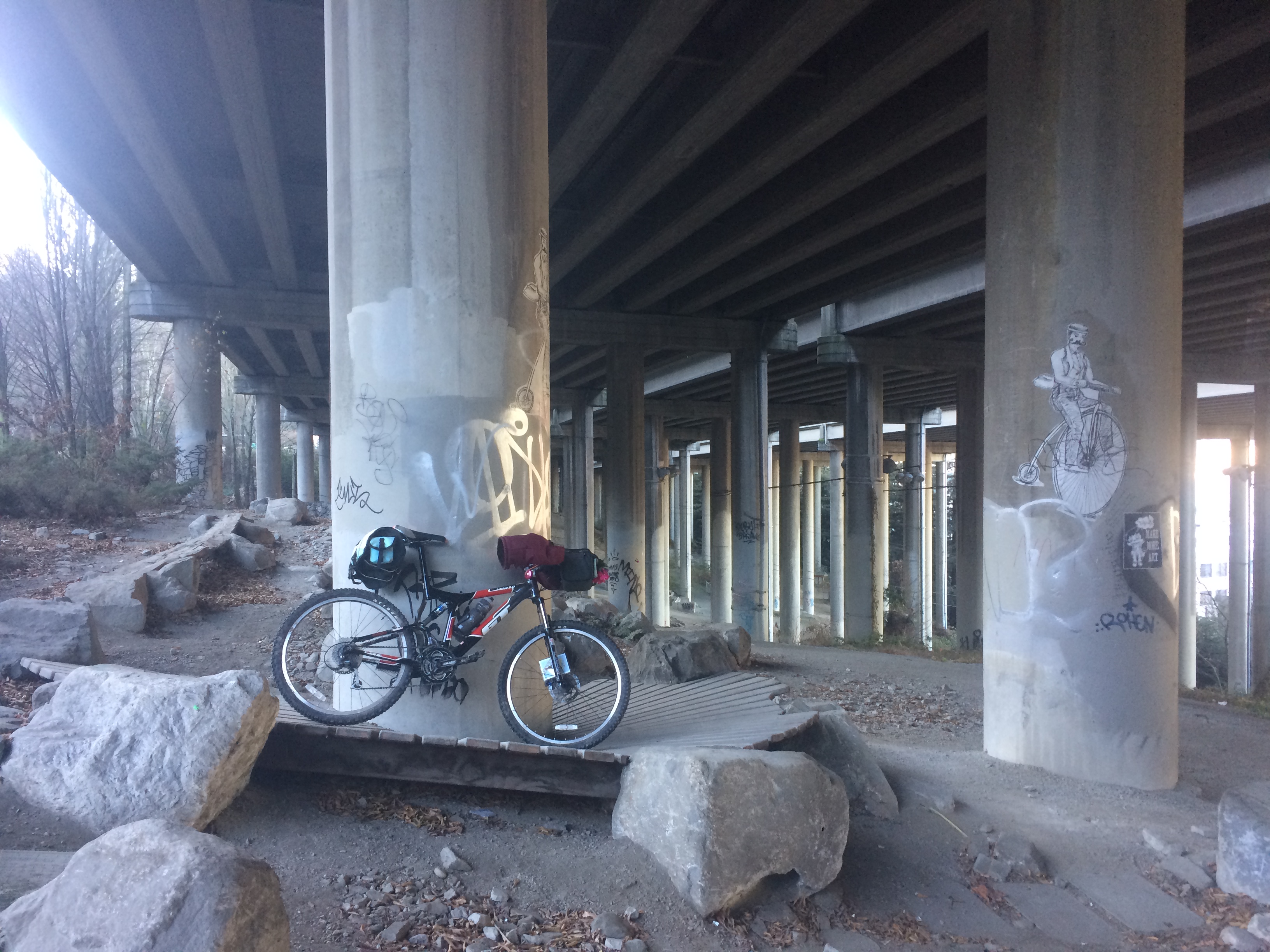On Thursday I took a shakedown ride to REI. This meant my mountain bike visited the I-5 Colonnade Mountain Bike Park for the first time! I didn’t do any mountain biking because it’s too technical for me. But I took a picture: